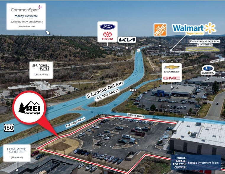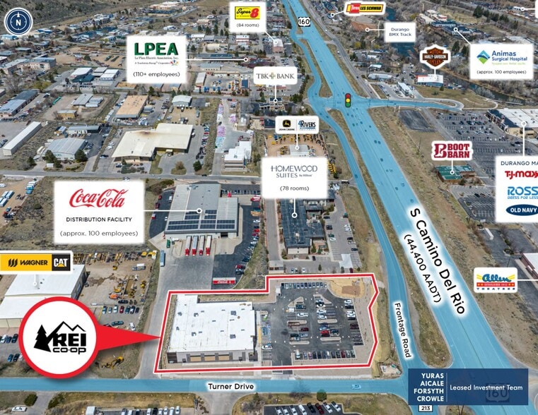 This modern 2025 construction features a 22,000 SF facility on a 2.31-acre parcel, designed to REI’s latest prototype for optimal customer experience and operational efficiency, thereby minimizing maintenance costs and boosting investor returns. With 103 parking spaces and direct access from Turner Drive, the site ensures ease of access for all customers. Durango itself serves as a year-round recreational hub, with popular attractions such as Lake Nighthorse, drawing 100,000 annual visitors, and Purgatory Resort, which consistently drives traffic. The property's advantageous proximity to CommonSpirit Mercy Hospital (82 beds) and Fort Lewis College introduces diverse traffic sources, and the area’s economic stability, evidenced by 99% employment within a 5-mile radius, strongly supports the long-term viability of this investment