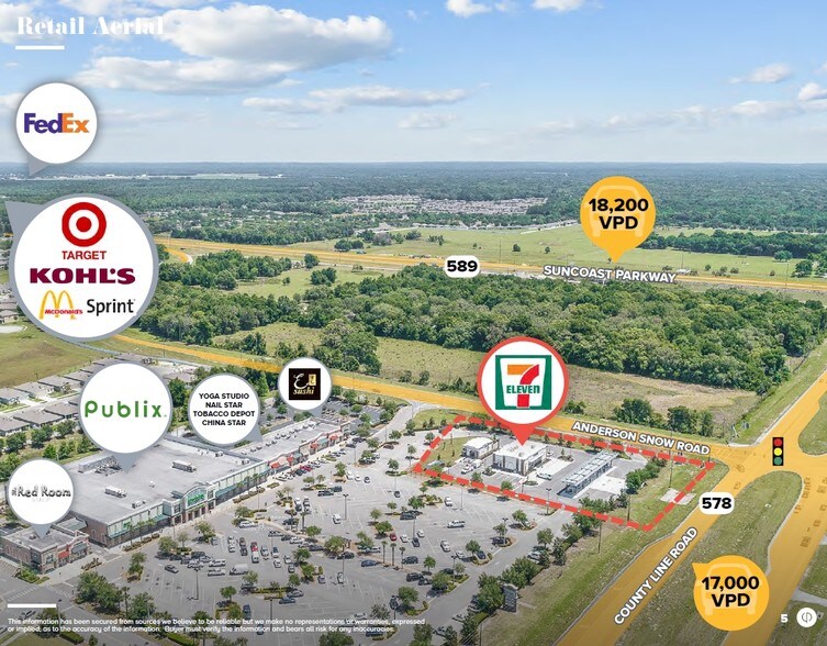 The offering is a newly constructed 7-Eleven located in Spring Hill, FL. The lease features a brand new 15-year absolute NNN lease with four 5-year options to extend. The lease is backed by the “AA-” credit of 7-Eleven and features 10% rent escalations every 5 years. The subject property is a pad to the Shoppes of Avalon, a Publix anchored shopping center which draws complimentary customer traffic to the site. Conveniently located on Anderson Snow Road which connects the Suncoast Parkway to the Villages of Avalon, a residential community with approximately 819 existing homes and additional homes under construction. The property also benefits from its location less than 1/2 mile from the Suncoast Parkway, a direct link to the Tampa-St. Petersburg area and Tampa International Airport. The subject property is strategically located in a dense and growing sector of Spring Hill, providing numerous competitive advantages in an already thriving economic sub-market. Spring Hill is located 40 miles north of Tampa, Florida. Just a 20 minute drive from Hernando Beach and the Gulf of Mexico, Spring Hill offers a range of outdoor activities for residents and visitors to engage in.