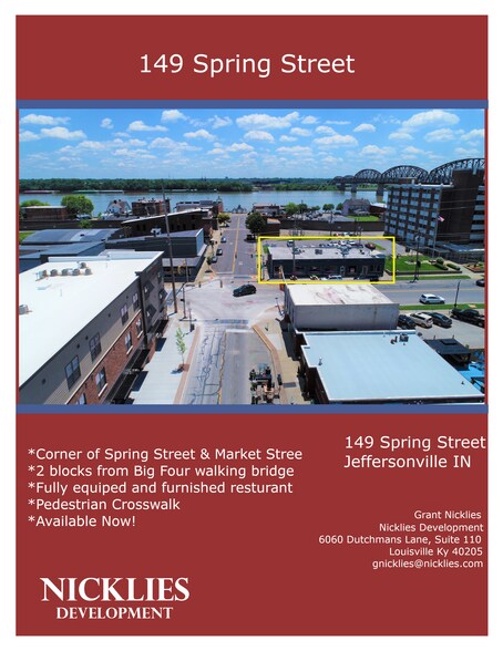 Located in downtown Jeffersonville on the corner of Spring Street & Market Street. This fully furnished restaurant is just 2 blocks from the Big Four walking bridge. Please call 502.494.6709 or email gnicklies@nicklies.com if interested.