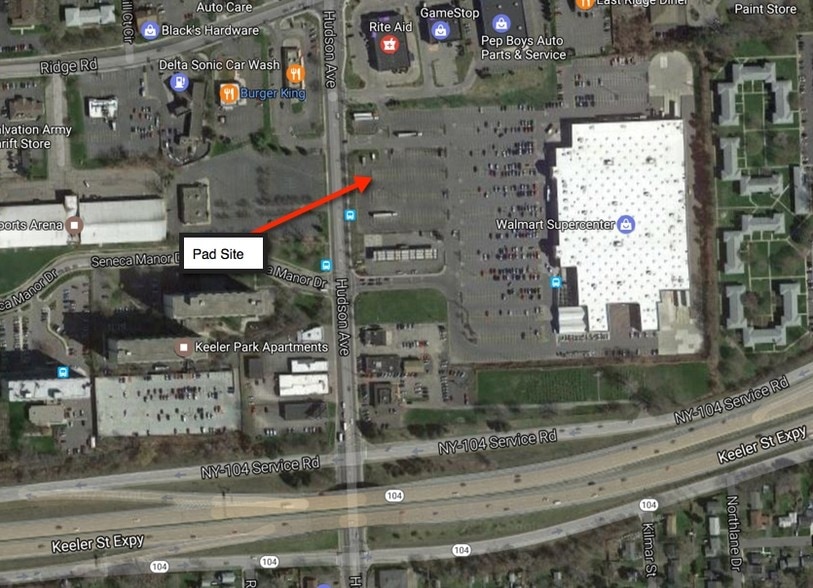 Pad site out in front of one of the best Super Walmarts in upstate New York. Several bus stops with access to multiple bus lines on the property. McDonalds, Burger King, and Delta Sonic close by. Great visibility, easy access and right off of NY-104