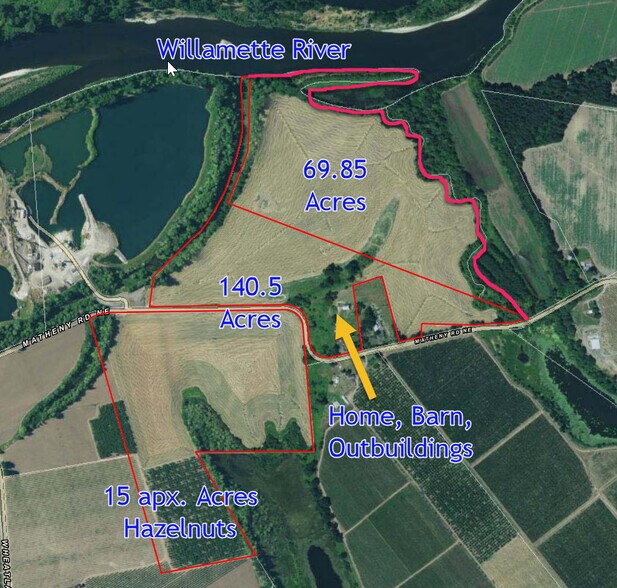 Amazing working farm located ON the Willamette River with 211+ acres of the most beautiful soil ever imagined! This is the first time in decades that this property, part of the historic Joseph Gervais Donation Land Claim, has come for sale! 3 Tax Lots included with a nice 2,191 SF ranch-style farmhouse, multiple outbuildings, and an absolutely classic Red 3-story barn (apx, 75 X 50)! 15 acres is a mature producing filbert orchard, about 154+ acres of beautifully tilled soil for any crop you can imagine. Hops farms, filberts, and row crops in the area are flourishing! Awesome Chehalem, Newberg, and McBee soils deposited by the Missoula Floods make this one of the most productive agricultural areas in the world. Water Rights, you ask? YES- 2 wells known to produce 600 & 700 GPM (buyer to verify) have historical water rights, and other surface rights have been granted as well. This is a real big-time farm property! Agrotourism and Agritainment options abound as well, and the Wheatland Ferry and Willamette Mission State Park are just a couple of parcels away. To top this all off, the incomparable Willamette River fronts the farm with a unique peninsula and inland waterway that offers fishing, camping, boating, and unlimited private recreation. There is too much to list here- so please call the Broker for a marketing packet on this one-of-a-kind offering! All offers are subject to the approval of the Trustee and the financial qualifications of the buyer. 1/2 of all minerals rights will be reatined by the seller. Any early offers will be reviewed on January 15th, 2024- The property will be marketed for a minimum of 2 weeks.