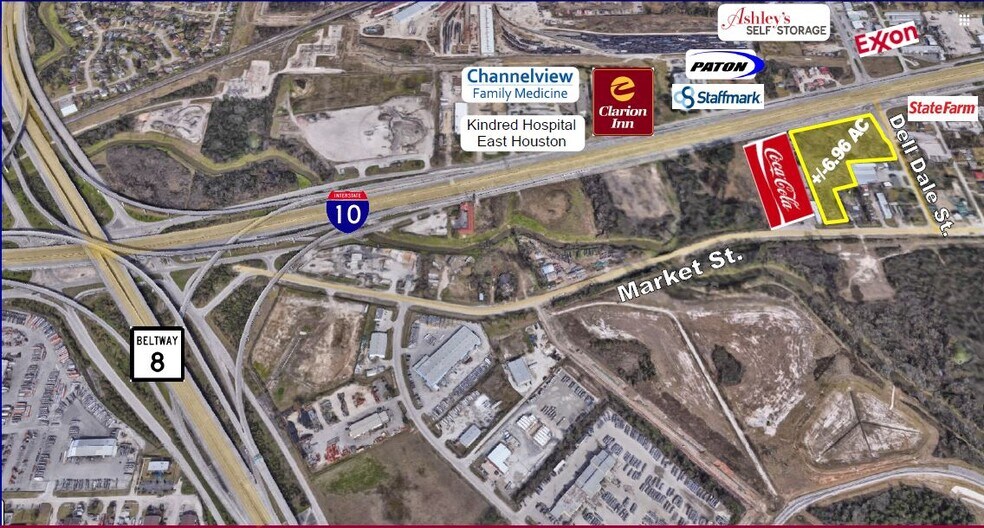 • Frontage: +/- 585.94’ on Service RD I-10 +/- 421.55’ on Dell Dale ST +/- 141’ on Market ST • Located at the Hard Corner of Service RD I-10 & Dell Dale ST • East of Houston • Minutes to Beltway 8 • Accessible to ALT 90 & Loop 610 • Next to Coca – Cola Vending • Approx. 14 min to Port Houston • Near Several Industrial Businesses Such As: NP (Metals Solutions Business), SAS (Packaging Company), ELG Metals (Metal Processing), etc.. *Great for Development &/or Investment*