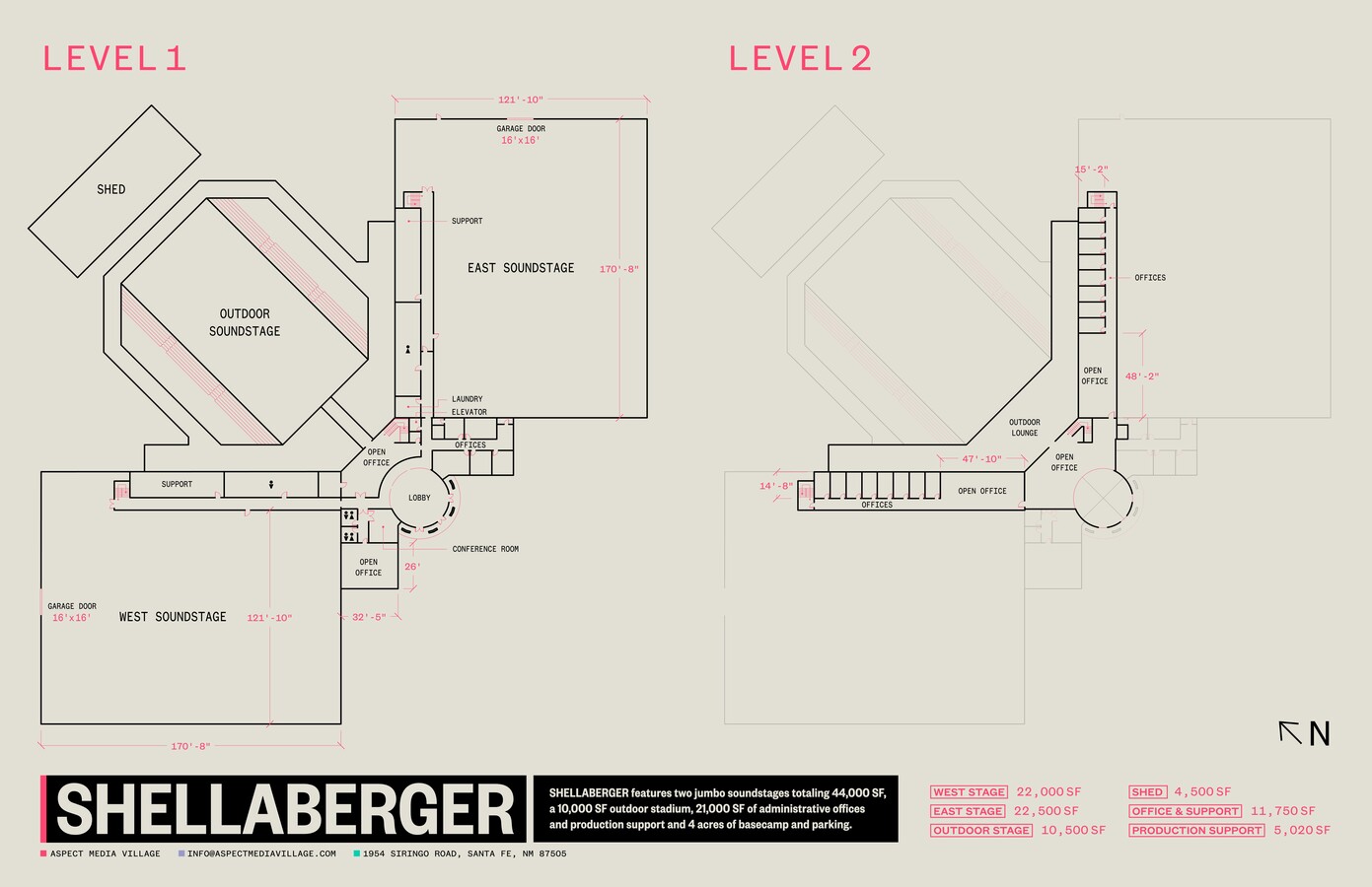 Aspect Shellaberger features two jumbo soundstages totalling 44,000 SF, a 10,000 SF outdoor stadium, 21,000 SF of administrative offices and production support, and 4 acres of basecamp and parking.