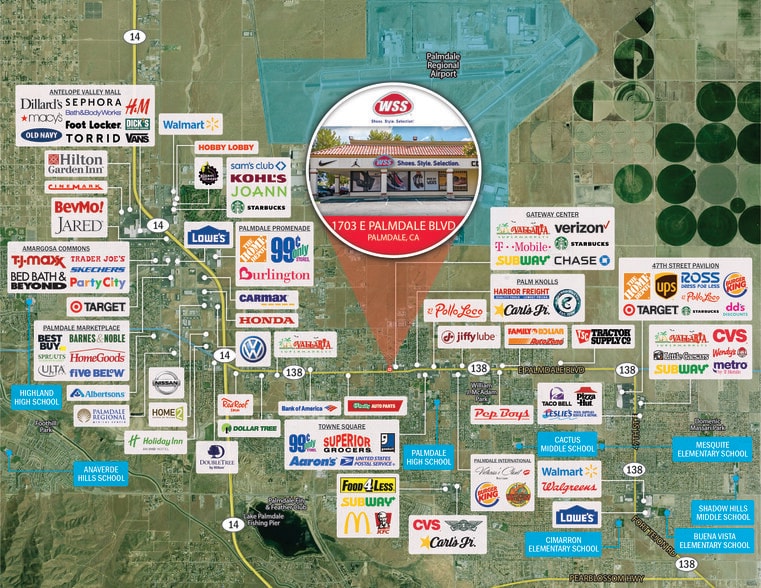 We are pleased to offer to qualified investors an opportunity to purchase a single tenant net leased investment (fee simple) that is fully occupied by WSS (Warehouse Shoe Sale), a Foot Locker subsidiary, with a newly signed 5-year extension and an additional five (5) year option period. Located in Palmdale, CA, the subject property is positioned at the intersection of East Palmdale Blvd (State Rte. 138) and 17th St East which sees over 25,800 VPD and is located near major travel corridors including California State Rte. 14 and the Pearblossom Hwy. This is an excellent opportunity to own a BB+ (S&P Credit Rating) NNN retail investment on a hard corner signalized intersection with over 5 lease years remaining and minimal landlord obligations.