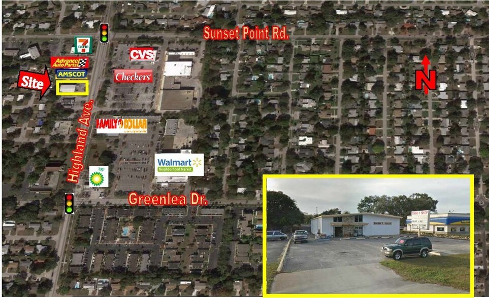Free standing 4,980 SF building with 3,600 SF open front area. Drive around building has garage door side access and double door rear access. Two restrooms, large office, storage room and rear service/shop area. Excellent visibility in area of many other drawing businesses. Zoned Commercial in city of Clearwater. Directly on the west side of N Highland Avenue 350 feet south of Sunset Point Rd.