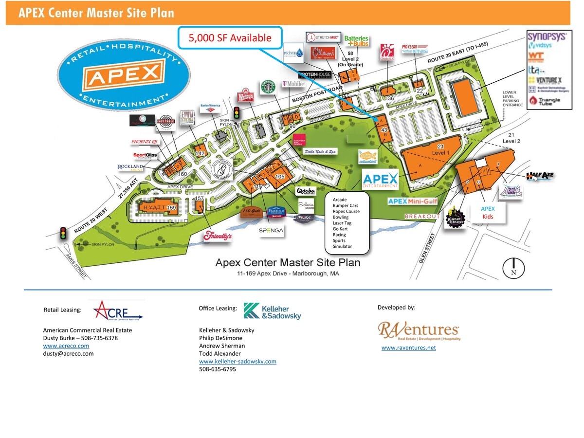 Visually stunning, operationally unique, the 500,000 SF Apex Center of New England is the optimal location in the I-495/Mass Pike/I-290 region for retailers and professional service providers. Its world-class interactive entertainment destination establishes immediate high-volume traffic and stature for businesses wanting to attract families with high incomes and expectations. Contact Dusty Burke to explore opportunities at Apex. Great visibility on Rt. 20 and in the Apex Center, great parking, great co-tenants. See brochure, site plan and space plans attached for details.