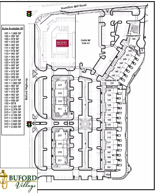 Buford Village is a specialty mixed-use project located in the heart of Buford, Georgia. The center is 62,453 square feet of retail, office and dining. It is situated next to an upscale, gated residential community. Cross-walks connect the project to City Hall, the Buford Community Center and Town Park, which consists of banquet and meeting space, a performing arts theater and outdoor amphitheater. Historic Buford and City of Buford High School are in walking distance. Complimentary co-tenancy includes Dominicks Italian Restaurant, Friends Grill, Mathnasium, Shenanigans Hair Studio, State Farm Insurance, Mathnasium, Harness Dance Studio, Brand Bank, Amy Cates Dental Office, Sound of Music and Red Clay Interactive. Retail and Restaurant space is available. Buford Highway and Hamilton Road in Buford, GA. Project is directly across the street from the Buford Community Center and City Hall. Buford Highway is a major commuter highway. There is a traffic signal at the main intersection.