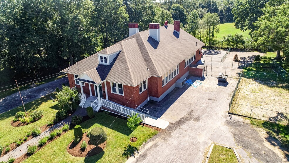 Former Village Green Preschool (daycare facility). 5,130 SF is available for lease (office/retail). This property is a beautiful brick single story retail/office space with huge ceiling heights and an open layout. Excellent space with three separate bathrooms, four large classrooms with abundant windows throughout space. Several fenced in sections outside of property perfect for outdoor activities and/or playgrounds. Easy access in rear of property for drop off and pick ups. First floor space is 5,130 SF with a full basement in addition to the square footage. ADA access in the front of property. Brick façade, recent landscaping and exterior painting. Property abuts town field, potential room for expansion/solar. Route 6 and I-195 are less