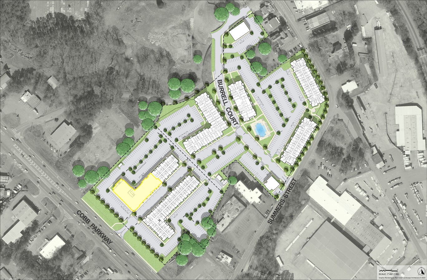 - Cobb Parkway visibility and access. Surface parking.