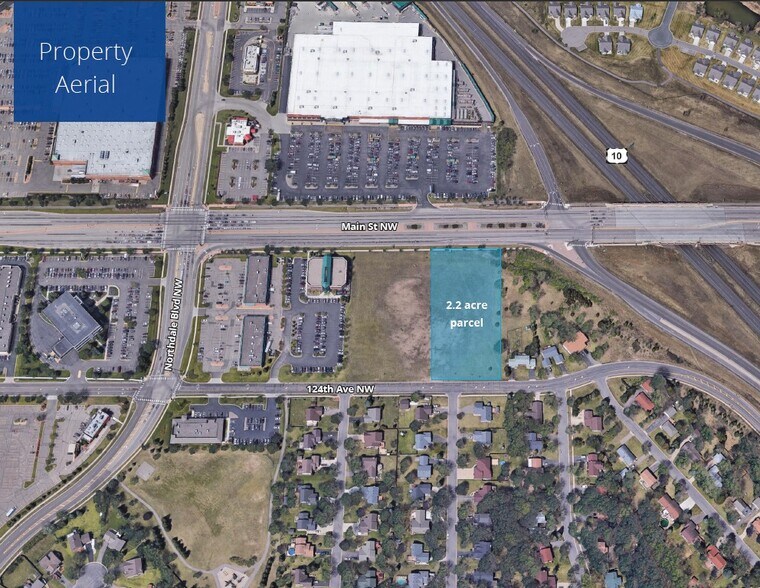 The site is surrounded by multiple uses: - To the North of the site are low and medium density residential. - To the West are a multitude of retail uses including Target, Starbucks, Costco, Home Depot, and more. - To the South is low-density residential, Mercy Hospital, and Anoka Ramsey Community College. - To the East is Highway 10, more retail including Lowes, and low-density residential.