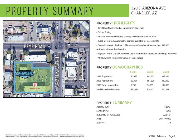 • Rare Downtown Chandler Opportunity For Lease! • Call for Pricing • 7,981 SF Firestone building coming available for lease in 2024 • 5,000 SF Top Tech Automotive coming available for lease in 2025 • Dense location in the heart of Downtown Chandler with more than 313,000 residents within a 5-mile radius • Adjacent to the City of Chandler’s City Hall and other municipal buildings, with over 17,000 daytime employees within a 1-mile radius