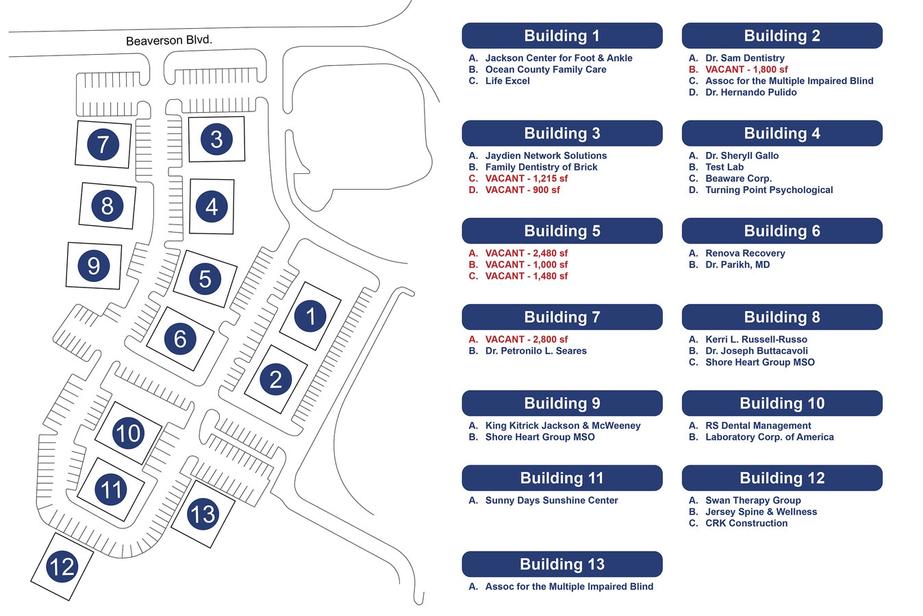 Situated in beautiful Ocean County, Lions Head Office Park offers convenient access from the Garden State Parkway, Route 70, Route 35 and Route 9. Lions Head Office Park consists of 13 one-story buildings located at the intersection of Beaverson and Brick Boulevards. Within walking distance to banks, eateries, and minutes from retail shopping and popular restaurants. Ample on-site parking is available.