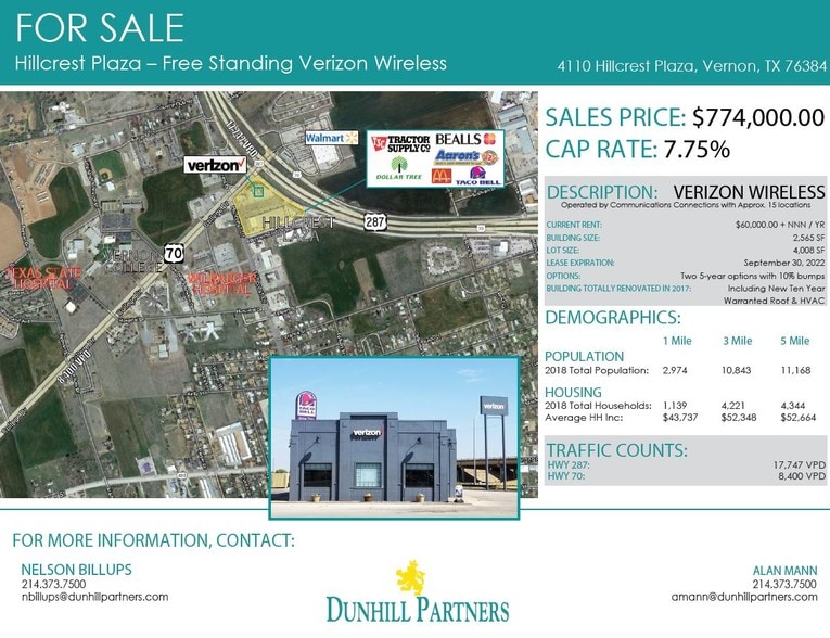 Free standing Verizon building on the corner of HWY 287 and HWY 70 College Drive. Building was re-developed in 2017 for Verizon. New Roof, HVAC, and contiguous to Hillcrest Plaza Shopping Center anchored by Tractor Supply, Taco Bell, and McDonald's. Verizon is operated by Communication Connections which owns several Verizon stores. 4,008 SF Land + Cross Easement Agreement for parking and access with Hillcrest Plaza.