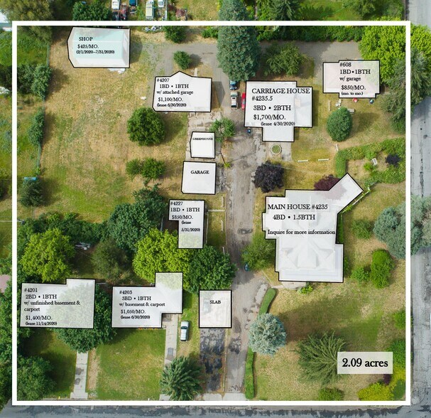 The perfect investor opportunity in Spokane's growing market. 2.09 acre Parcel includes 7 single family homes, a 24 x 40 shop, 2 car garage, & greenhouse. Including a significant Spokane Home that is on the WA. Heritage Register. This one of a kind Prairie-style home boasts character from the inside out and features: Dark Stain fir trim, wainscoting, oak floors, beamed ceilings and extensive woodwork and built in cabinetry with many original leaded windows.So many possibilities with this home & property.