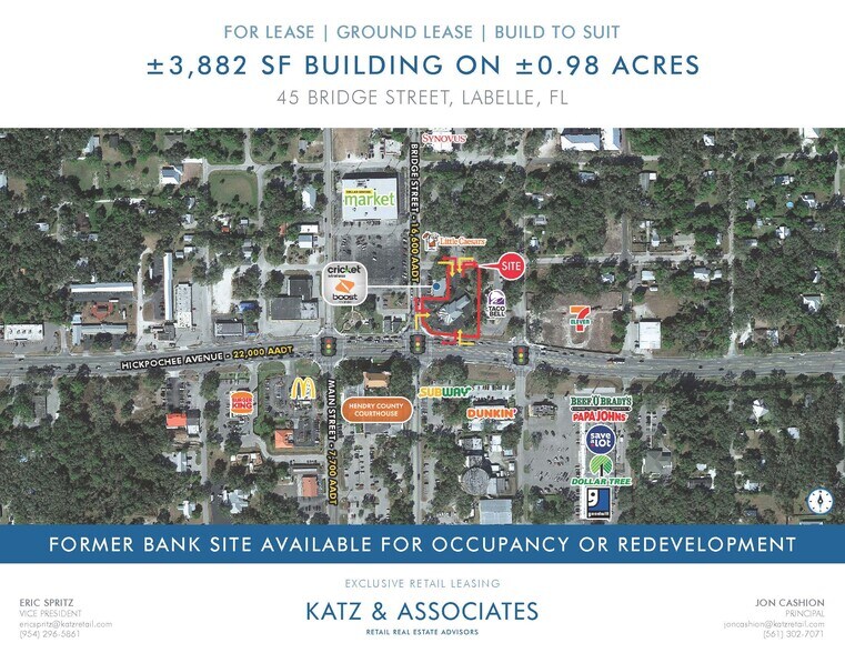 ±3,882 SF building on ±0.98 acres for lease, ground lease, or build to suit. Former bank site available for occupancy or redevelopment. Main & Main intersection in LaBelle. Major thoroughfare from southwest to southeast Florida. Located at hard corner signalized intersection