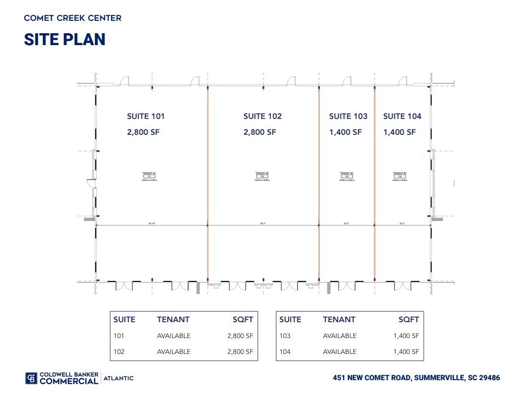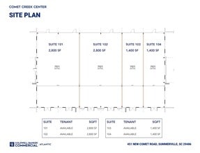 Comet Creek Center located at 451 New Comet Road in Summerville, South Carolina, is slated for the development of an 8,400-square-foot strip center. Construction is anticipated to commence this summer with an expected Q4 2026. The center is currently available for pre-leasing, offering flexible retail spaces ranging from 1,400 to 8,400 square feet. Situated just outside the Carnes Crossroads and Sangaree housing developments, the property is near the bustling intersection of Saint James Avenue and North Main Street, ensuring high visibility and accessibility. This development presents a prime opportunity for retailers seeking a customizable brand new space in a rapidly growing area of Summerville. Interested parties are en- couraged to contact the leasing brokers for more information on lease terms and avail- able amenities.