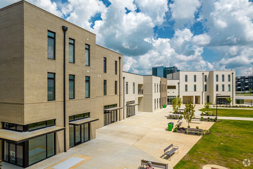 Located in the heart of Rogers, AR. Pinnacle Heights is the premier location for your business. Pinnacle Heights is steps from the Walmart AMP, northwest Arkansas' largest music venue. Other walkable ameneties include nearby retailers, Top Golf, numerous Class “A” office buildings, along with restuarants, coffee shops, and thousands of people visiting Pinnacle Hills each day. Pinnacle Heights was developed with live/work/play in mind. Ground floor retail and live/work spaces benefit from the hundreds of tenants who live above the spaces and also call the development home. Tenants at Pinnacle Heights will also benefit from the many community events the development hosts each year including tenant appreciation parties, concerts on the lawn, and other opportunities to connect with potential customers and clients. Parking for retail and live/work space is located (unreserved) both on the street as well as in the on site parking deck.