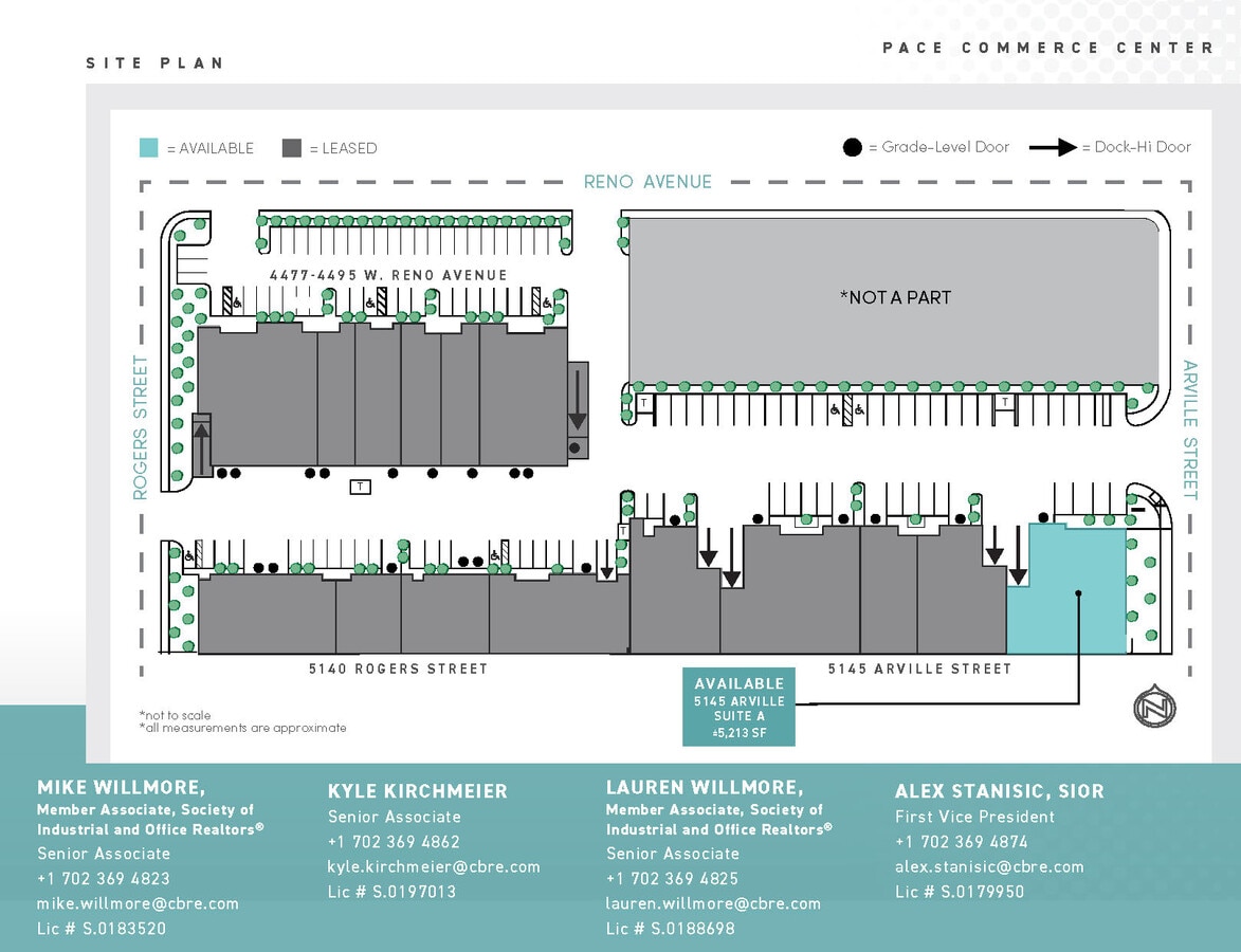 Pace Commerce Center offers Office/warehouse/showroom space with frontage on Reno Avenue and Arville Street. The property is located in the Southwest submarket, just South of Tropicana Avenue at West Reno Avenue and Rogers Street. The central location provides excellent access to the Strip, the I-15 via Tropicana, UNLV, the I-15/I-215 Interchange and is surrounded by ample retail and service amenities. Pace Commerce Center is an approximately ±61,169 SF multi-tenant office/warehouse Project, comprised of three buildings on ±3.34 acres. Property features include grade level loading, dock access to some units, air conditioned office space, and ample parking. Ownership is pleasant to work with and eager to lease the space. For more information or to schedule a tour, contact Mike Willmore at 702-369-4823 or Lauren Willmore at 702-369-4825.