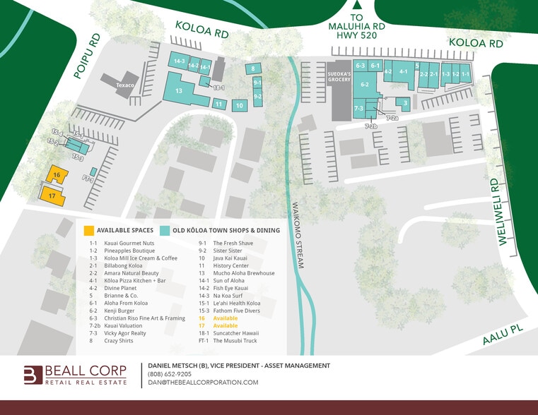 Old Koloa Town is a 24,000 square foot, historic street-front shopping village located in the heart of Kauai’s south shore. The property is within the Poipu resort district which includes 3,175 visitor lodging units and eight world-class resorts. The Kauai retail and visitor market thrived in 2024, welcoming 1,369,012 visitors. This historic town has become a popular hub for both visitors and locals, offering a carefully curated mix of retailers and restaurants. KAUAI HIGHLIGHTS: • Visitors to Kauai in 2024: 1,369,012 • Kauai visitor spending was $2.85B in 2024 • Total air seats to Kauai in 2024: 990,225 • Kauai average daily visitor census: 27,786 • Visitor per person per day spending on Kauai: $279.90