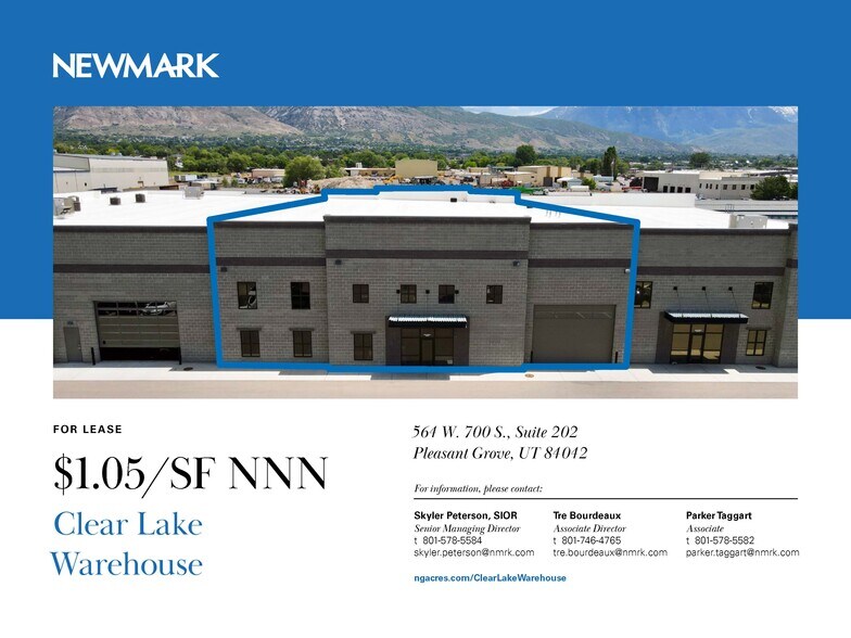 Clear Lake Warehouse is a recently built CMU block building zoned as M-D, and is located in the highly desirable Pleasant Grove city with easy access off I-15 exit #275. Unit 202 is available for lease which is 7,814 SF for $1.05 / SF NNN. (Warehouse: 4,714 SF / Office: 1,550 SF / Mezzanine: 1,550 SF). The space has an open reception area, two (2) restrooms, clear height: 22', Power: 400 A 208 Y 120 V 3-phase 4-wire, grade level door: 18'x14', one (1) swamp cooler, one (1) gas forced heater, fire sprinkler system, clerestory windows, LED lighting throughout, and a mop sink in the warehouse.