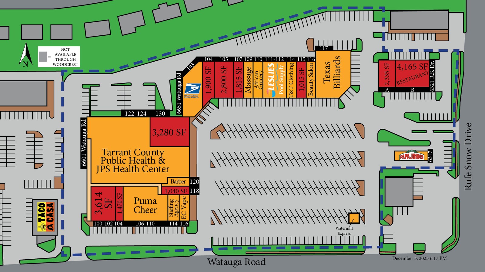 Watauga Marketplace is an approximately 72,000-square-foot shopping center located at the busy intersection of Rufe Snow Drive and Watauga Road. This center has been recently renovated, and tenants include local restaurants, neighborhood service retailers, and national retailers. Commercial suites at this center are available for lease, ranging from traditional retail storefronts and restaurants to offices, as well as for medical or other professional service providers. Additionally, built-out, second-generation suites are available, designed for quick and seamless occupancy. Second-generation spaces include a doctor’s office, a fitness center with soaring ceilings and office space (previously occupied by a chiropractor), and a premium end cap restaurant suite. Watauga Marketplace serves as a prime location for businesses seeking increased visibility, with a daily traffic count of 33,690 vehicles on Watauga Road and Rufe Snow Drive. Visibility isn’t the only advantage the location offers, as this center benefits from a highly affluent consumer base within a 5-mile radius, with an average household income of $105,558, contributing to $3,775,860,714 in consumer spending. Woodcrest Capital welcomes first-time and franchise businesses to its centers with easy-to-read leases and flexible terms. Woodcrest is also sufficiently sophisticated to please the largest of national credit tenants. As a family-owned business with over 40 years in commercial real estate, Woodcrest owns and operates everything from Class A centers in the busiest neighborhoods to troubled centers it’s rehabilitating in struggling rural communities. Give us a call today to find the right location for your business, as we usually have multiple retail opportunities in the immediate area.