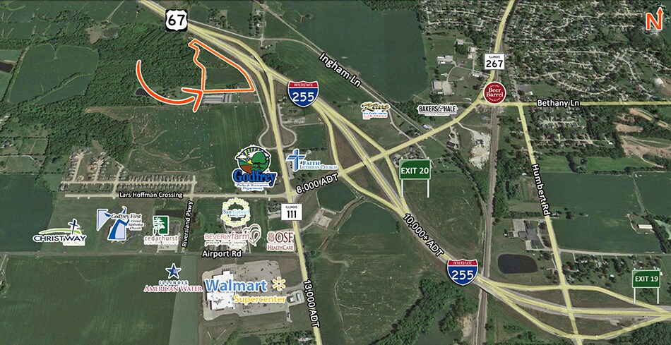 Interstate Visibility Development 14.08 Acres with 1,700' Frontage Available for Commercial Development at the Interchanges of IL-255 and IL Route 67. Property Can Be Subdivided. Property is Located 3/4 Mile from the Wal-Mart Supercenter Development and Lewis and Clark Community College Campus. The Riverbend Region has had significant Residential and Commercial Development Investment with the Extension of IL-255 in the Transportation Corridor. Additional Corridor Information Available Upon Request.