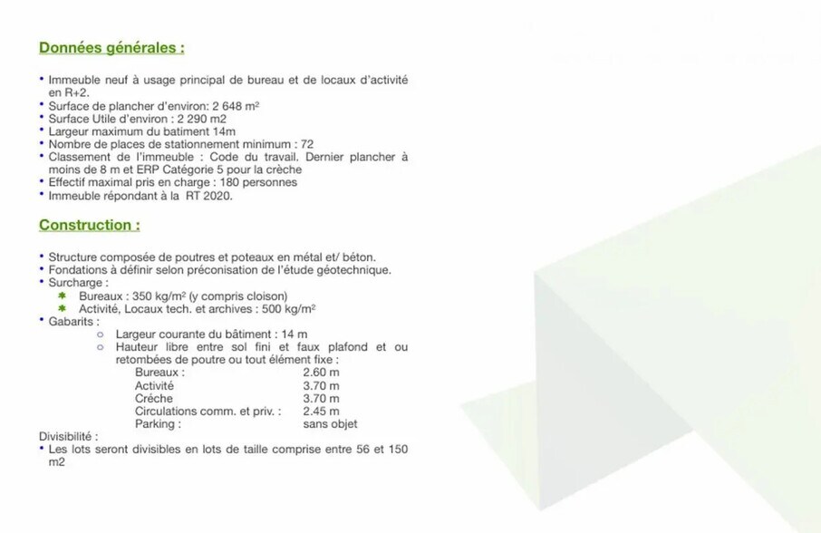 OCTOPUS IMMOBILIER offers for sale office spaces, showrooms, or activity spaces in a new building located in the new THEGRA zone in BALMA. **New building primarily designed for office and activity spaces** - **Structure:** 3 levels (Ground floor + 2 floors) - **Floor area:** Approximately 2,648 m² - **Usable area:** Approximately 2,290 m² - **Maximum building width:** 14 meters - **Minimum parking spaces:** 72 - **Building classification:** Complies with labor code regulations. Last floor is under 8 meters high and includes a category 5 ERP (Establishment Receiving the Public) for a daycare center. - **Maximum capacity:** 180 people - **Compliance:** Meets RT 2020 energy standards - **Construction:** Metal and concrete beams and columns - **Foundations:** To be determined based on geotechnical study recommendations - **Load capacity:** - Offices: 350 kg/m² (including partitions) - Activity spaces, technical rooms, and archives: 500 kg/m² - Ground floor area: 613 m² **Location/Transportation:** - Easy access to major highways: - A61, A68 (Entrance) - A61 (Exit La Roseraie) - A62 (Entrance Toulouse-Center, Montpellier, Barcelona, Foix) - A62 (Exit A68) - A68 (Exit L'Union, Montrabé)