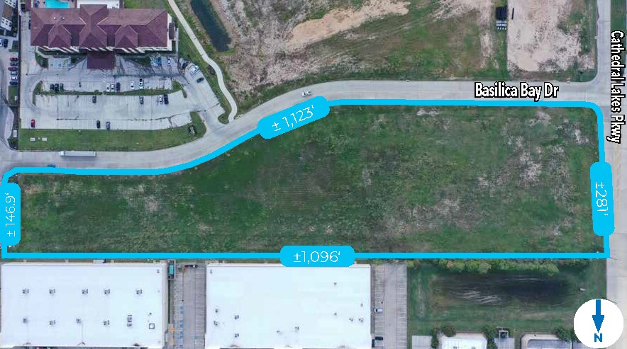 Location: Cathedral Lakes Parkway & Basilica Bay Dr Size: ±5.839 Acres Flood Plain: 500-year Frontage: 1,123 ft on Basilica Bay Dr | 281 ft on Cathedral Lakes Parkway Detention: Regional Detention Provided