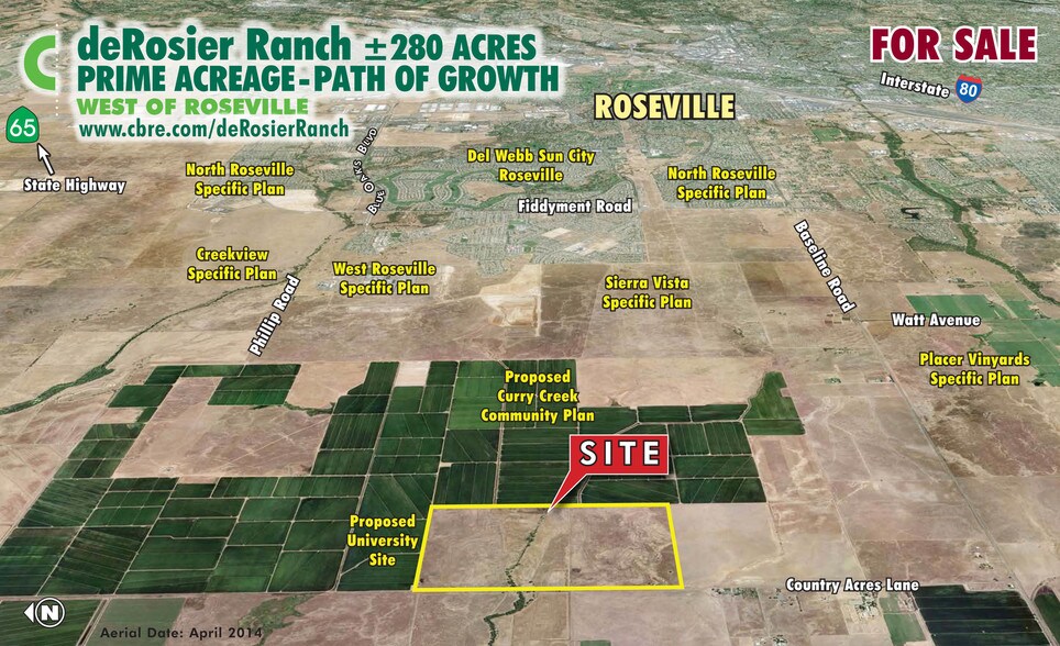 ere are few opportunities more ideal for a land investor than controlling large acreage between Roseville and Sacramento in an area already contemplated for growth. South Placer County continues to be a highly desirable place to locate and Placer is consistently among the fastest - if not the fastest - growing counties in California. For its part, the City of Roseville is acknowledged as a leader in effective planning and community development. From nationally recognized public schools and abundant parks to excellent shopping and medical facilities, Roseville has been a steady highlight of the Sacramento region. The build-out of Roseville' s Sierra Vista Specific Plan will bring the city of Roseville and major infrastructure to the edge of the Curry Creek Community Plan. The deRosier Ranch already enjoys access and proximity to existing job centers and area amenities. The Curry Creek Community Plan, of which deRosier Ranch is a part, is easier to get to, has less physical constraints to develop and is better located than many areas in South Placer County where development has already occurred. deRosier Ranch is located just west of the City of Roseville in South placer County