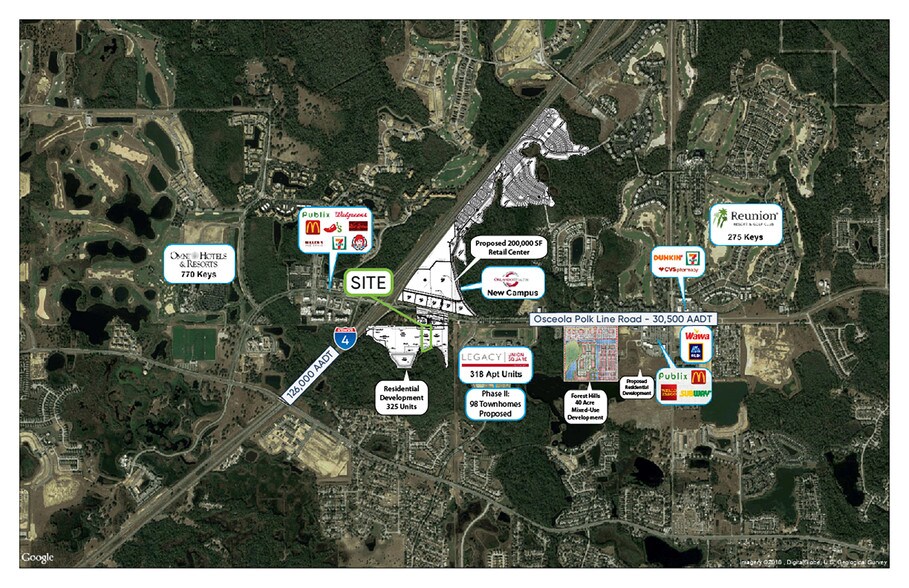 -Instant Access and Potential Signage on Interstate 4 -120-Room Hotel Opportunity -Orlando Health's 25-Acre Campus will bring in 2,000 Full-Time Employees in 2020 -8 Million+ Overnight Visitors in ChampionsGate (770 Keys) & Reunion Resort (275 Keys), Spending $3.4 Billion a Year -Delivery: Pad Ready-Graded, Utilities Stubbed, Master Retention & Entrance Roads -The Site will Front a Residential Development that will Include 325 Multifamily Units -Across from Reunion Village, a 200,000 SF Retail Center