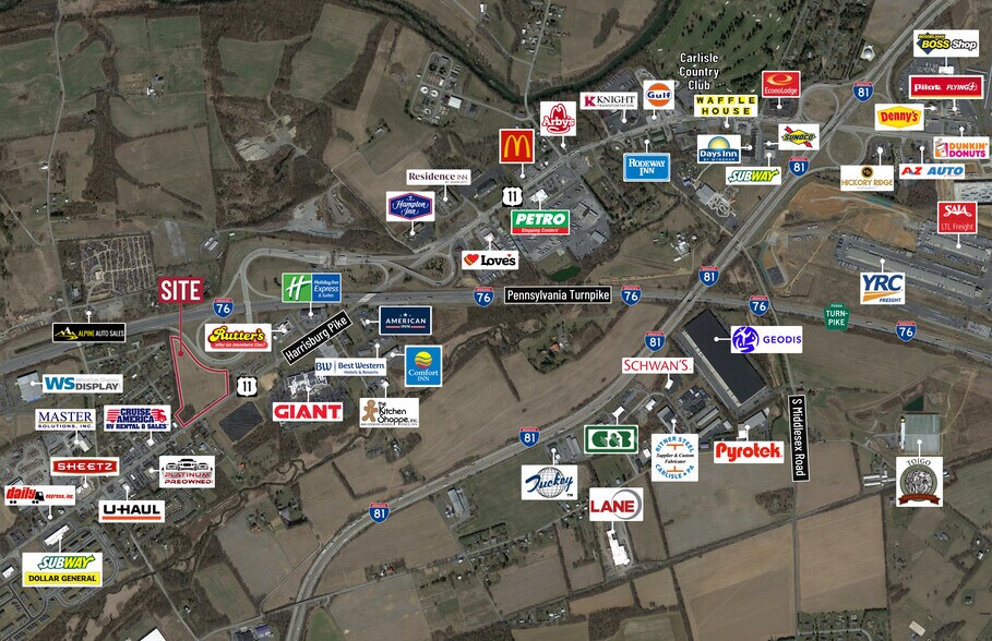 12.79 Acres of Commercial Highway land available on the heavily traveled Route 11 (Harrisburg Pike) in Carlisle, PA. Wide variety of permitted uses including retail businesses, business service, personal service, vehicle, trailer, mobile home sales & service, hospitality, warehousing (special exception), truck stops (conditional) and dealerships. Well documented location along Central PA's "Miracle Mile" between I-76 abd I-81, home to the regions most densely populated LTL, truckload & 3 PL providers. Corporate neighbors include Amazon, YRC, XPO, ABF, Old Dominion, Ahold, SAIA, Schneider, and Geodis.