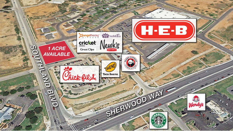 - 1 Acre Pad Site Available in a tremendous regional retail trade area - Anchored by HEB - Shadow anchored by Walmart Supercenter, - Sam’s Club, and Lowe’s Home Improvement - Located NEC of Sherwood Way & Southland Blvd.