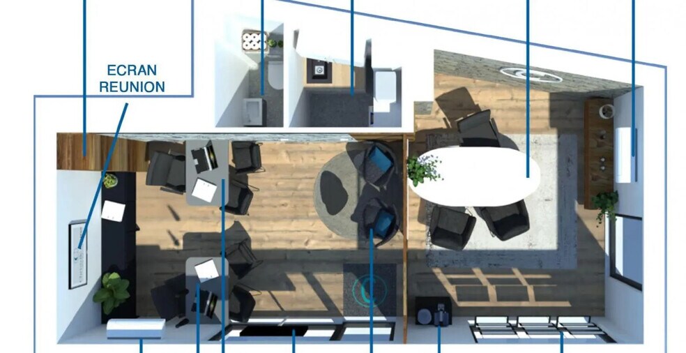 32.23 m² consisting of a main space with 2 fixed desks and a built-in closet, a meeting room with integrated furniture and a second exit via a glass door. Small equipped kitchen, separate restroom.