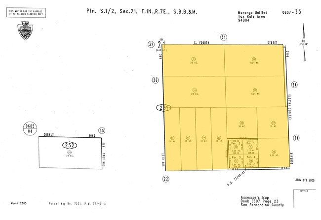 THAT PORTION OF THE SOUTHEAST QUARTER OF SECTION 21, TOWNSHIP I NORTH, RANGE 7 EAST, SAN BERNARDINO BASE AND MERIDIAN, IN THE IN THE COUNTY OF SAN BERNARDINO, STATE OF CALIFORNIA DESCRIBED AS FOLLOWS:BEGINNING AT THE SOUTHEAST CORNER OF SAID SECTION